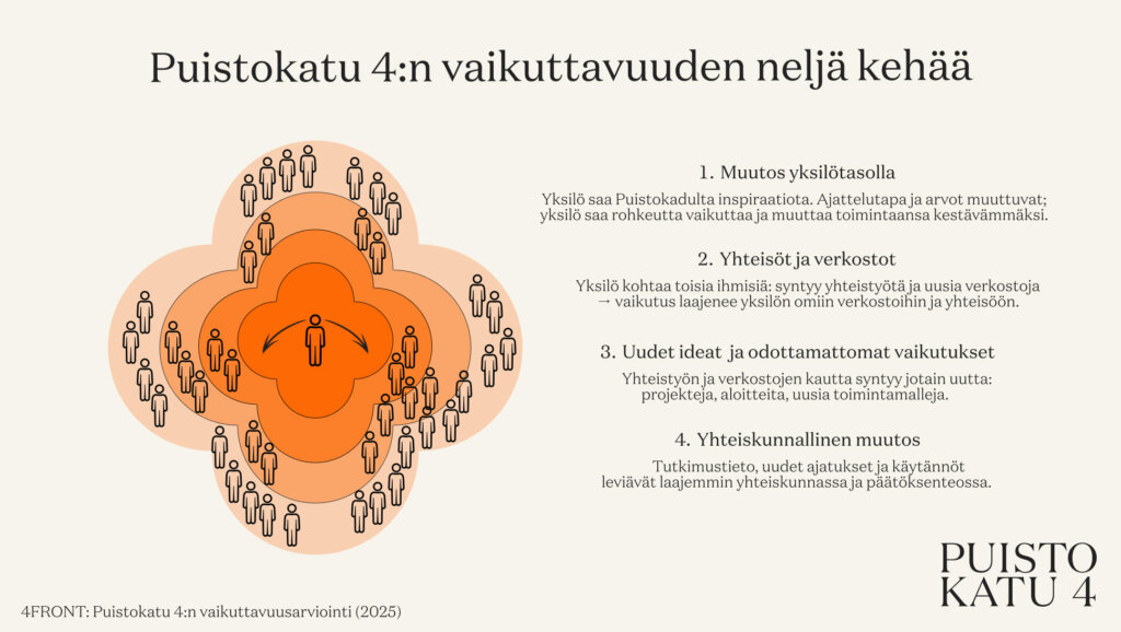 Vaikuttavuusarvioinnin pohjalta kehitetty malli jäsentää Puistokatu 4:n vaikuttavuutta neljän toisiaan vahvistavan kehän avulla: